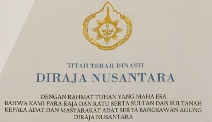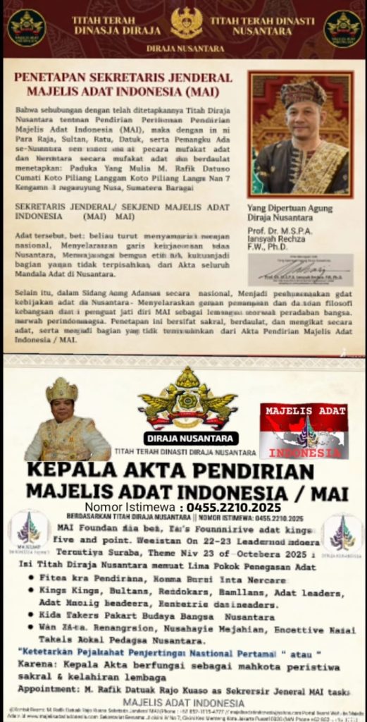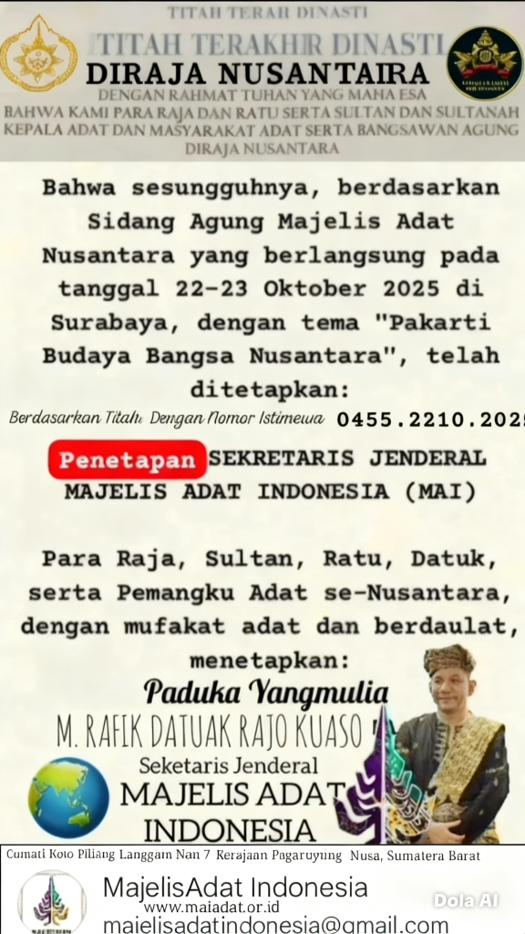 ——- Bahwasanya yang bertanda tangan di bawah ini, Raja dan Ratu Serta Bangsawan Diraja Nusantara, dengan ini Bertitah secara penuh terhadap pendirian dan pengukuhan Majelis Adat Indonesia (MAI) sebagai wadah etik, kultural, dan moral bangsa untuk meneguhkan marwah budaya Diraja Nusantara.———————————————————————————-