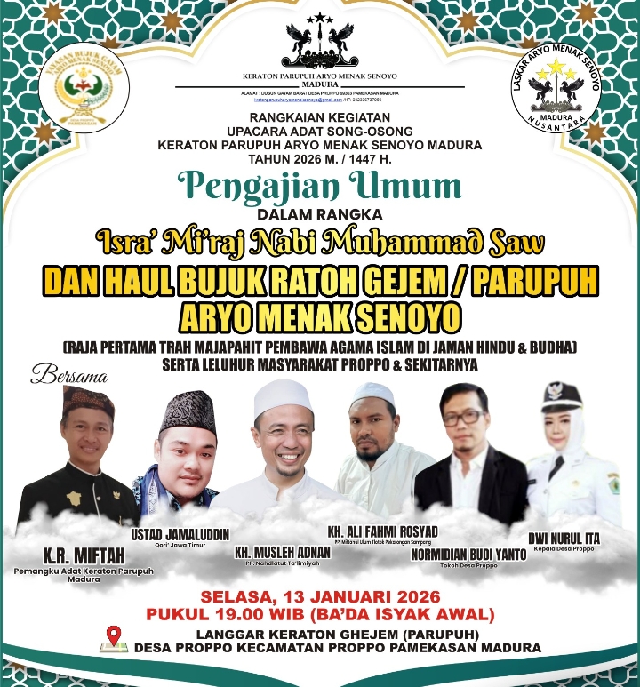 Madura — Dalam Rangkaian Kegiatan Upacara Adat Song Osong Keraton Parupuh Aryo Menak Senoyo Madura digelar Haul Agung Raja Aryo Menak Senoyo sekaligus Peringatan Isra Mi’raj Nabi Muhammad SAW, Selasa (13/1/2026). Kegiatan berlangsung khidmat dan maraton sejak pagi hingga malam sebagai bagian dari Rangkaian Upacara Adat Song-Osong Keraton Parupuh, menjadi ikhtiar merawat sejarah, adat, serta nilai-nilai keislaman yang berakar kuat di Madura.